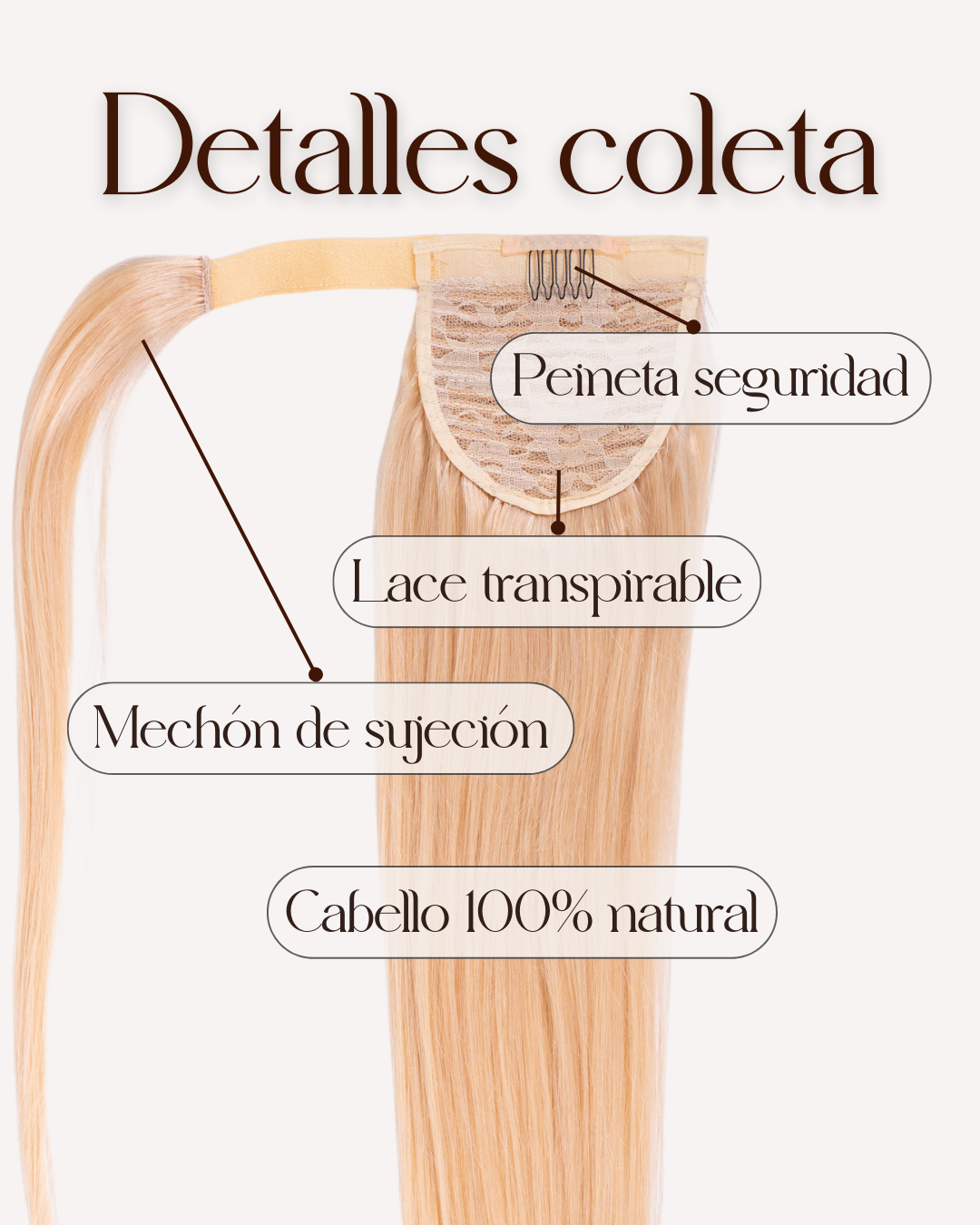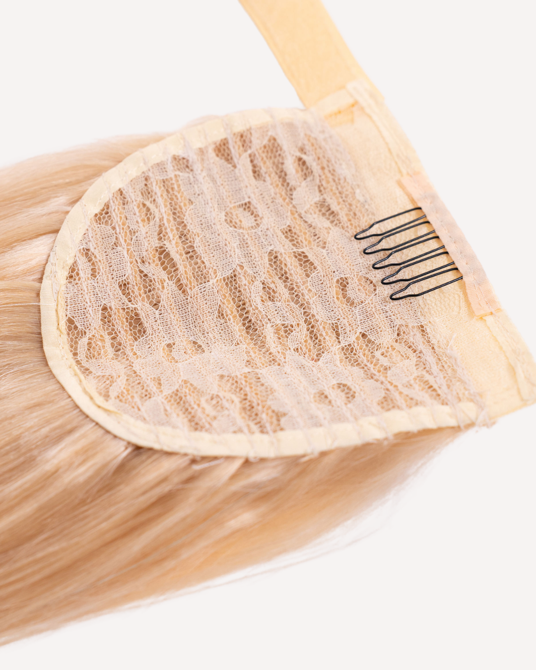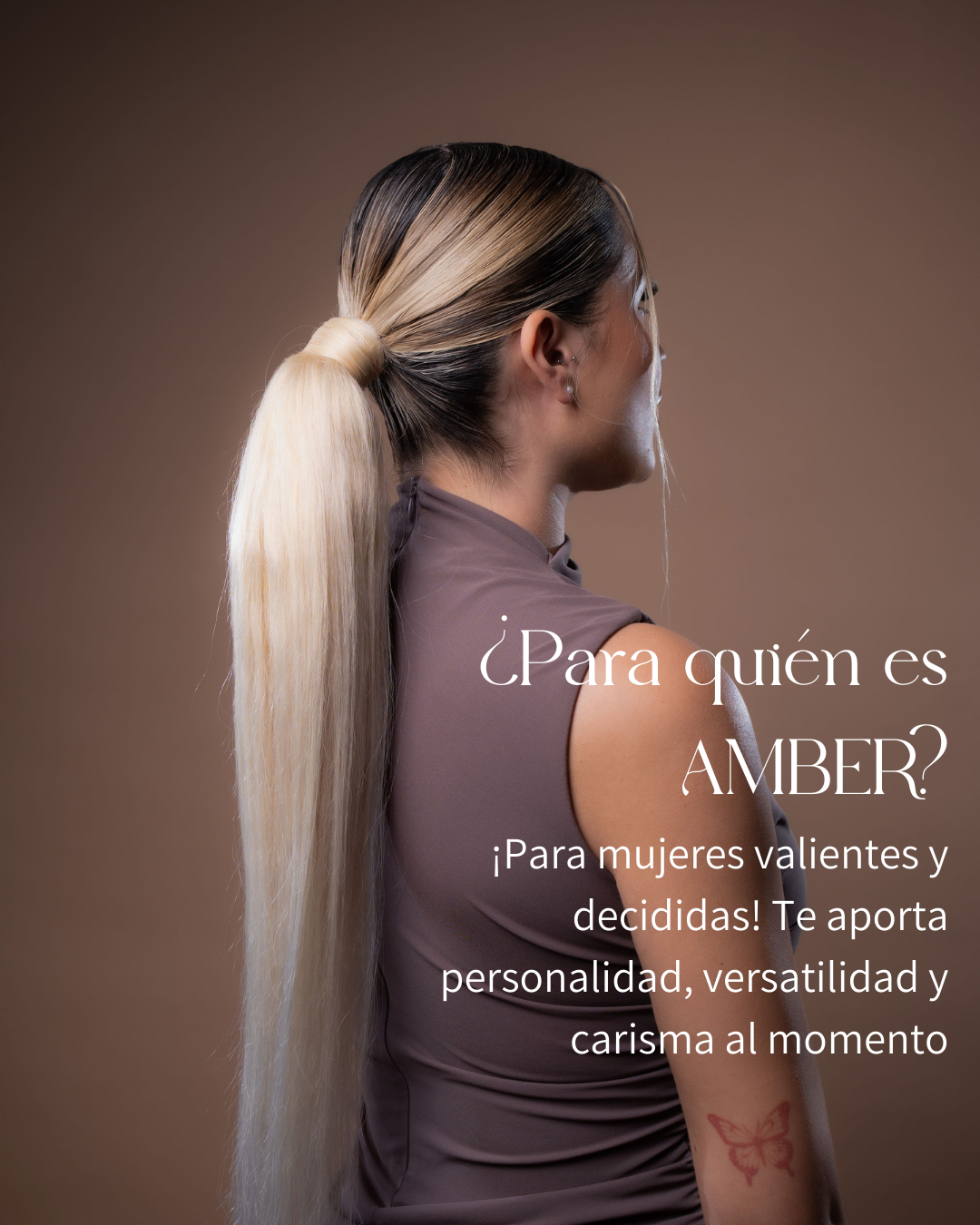 Amber es la coleta lisa rubia platino que aporta luz, largo y elegancia al instante. Hecha con cabello 100% natural, se funde con tu melena para un acabado suave, brillante y completamente indetectable.